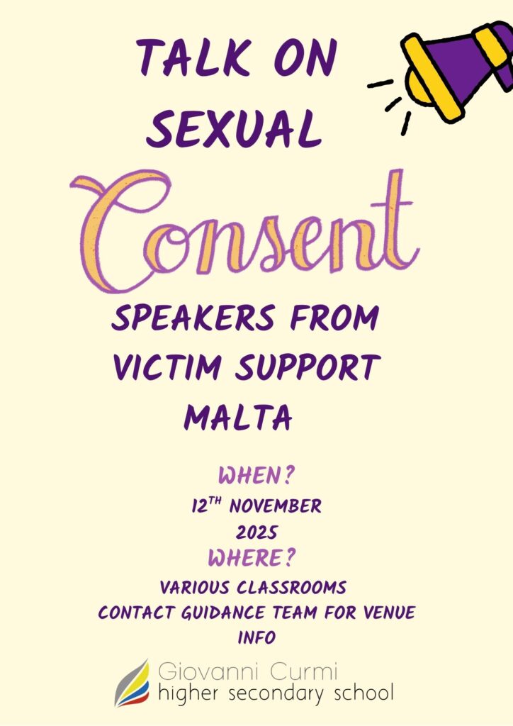 The school will be hosting an educational talk on sexual consent on Wednesday, 12 November 2025, delivered by speakers from Victim Support Malta. The talks will take place in various classrooms throughout the school. Students will be informed of their allocated venue and time through the Guidance Team, who may be contacted for further details.