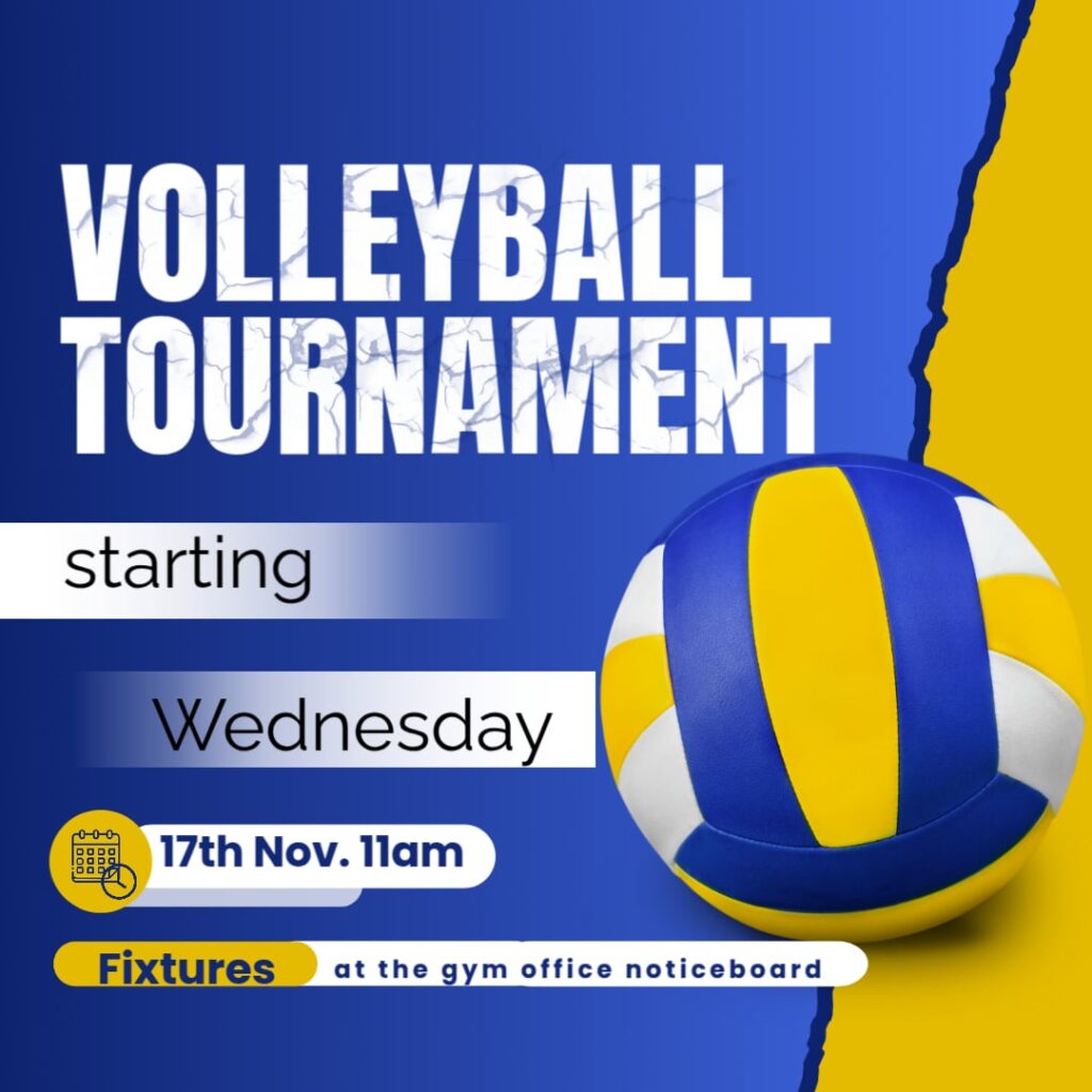The Volleyball Tournament will commence on Wednesday, 17 November, starting at 11:00. All participating teams are reminded to check the fixtures, which are available on the Gym Office noticeboard. Teams are expected to be punctual and prepared for their scheduled matches.