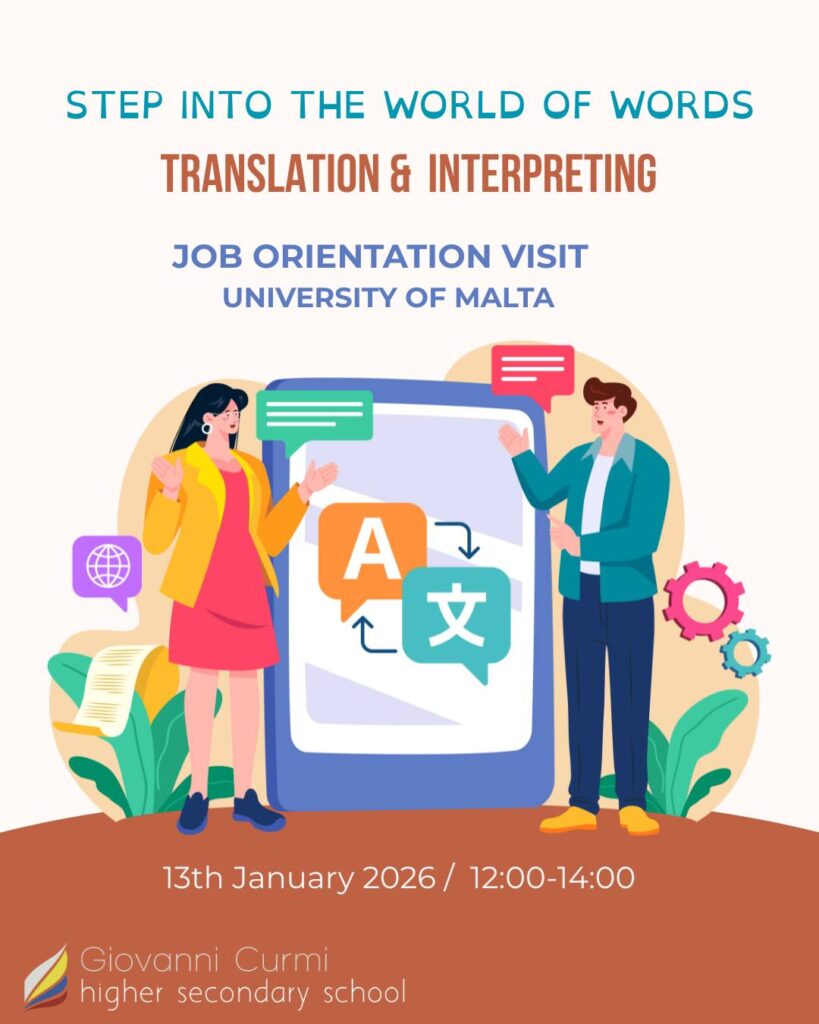 Students are invited to participate in a Job Orientation Visit focusing on Translation and Interpreting, organised in collaboration with the University of Malta. The visit will take place on Tuesday, 13 January 2026, between 12:00 and 14:00. The session aims to provide students with insight into the academic pathways and career opportunities within the field of […]